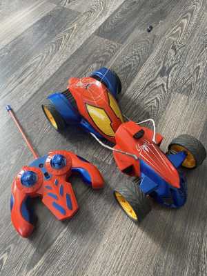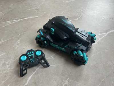 В комплект входят:Машинка с пультом на РУ, работающая от АА батареек, пульт от макси-батарейки и нарукавный бластер с 3...