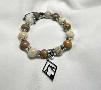 Браслет из окаменелого коралла и молочного перламутра с подвеской-горы⛰️ 💎 Окаменелый коралл: символ мудрости и защиты.