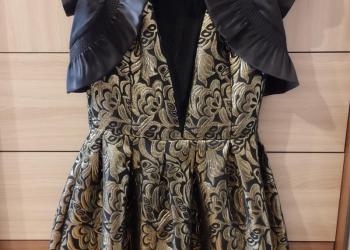 Очень красивое праздничное платье, золото с черным, спереди вставка. Окружность талии 66см, по спинке 36 ,длина юбки 46 см.