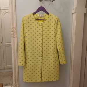 Пальто женское жёлтого лимонного цвета с узором в горошек.
