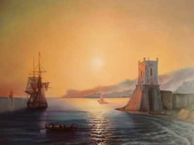 Копия картины Айвазовского "Заход солнца в Феодосии". Написана художником Т. Белопуховой с подписью автора. Размер 60х80 см.