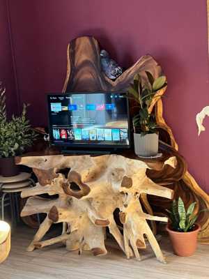 Размеры: 90 см высота, 120 см длина, в глубину 42 см. Вес около 120кг. Материал корень тика, Индонезия.