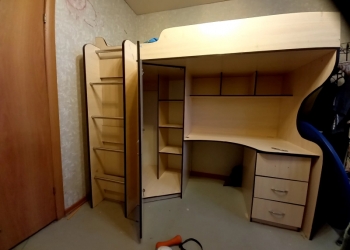Продам детскую кровать чердак со столом тумба с ящиками шкаф в лестнице ящики. Длина 2330. Глубина 1200. Высота 2000.