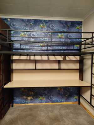 Сверху кровать большая а с боку 3 шкафчика снизу стол большой и рядом полка сзади есть большой шкаф для вещей и одежды и...