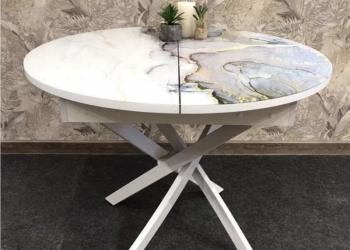 Стол обеденный круглый раздвижной с закаленным стеклом S330 столешница Акварель на белых ножках.