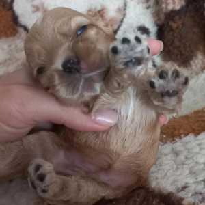 Предлагается щенок английского кокер-спаниеля чало-рыжего окраса. Сука. Родилась 05.03.2025.